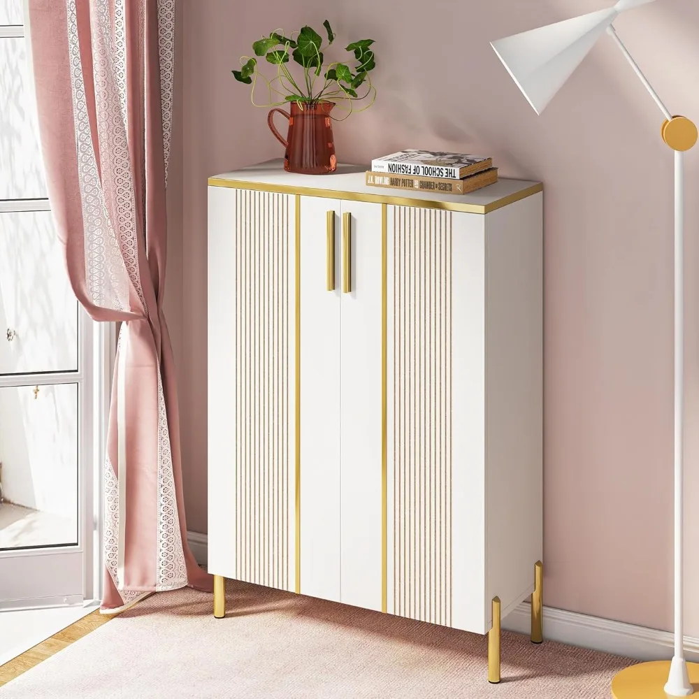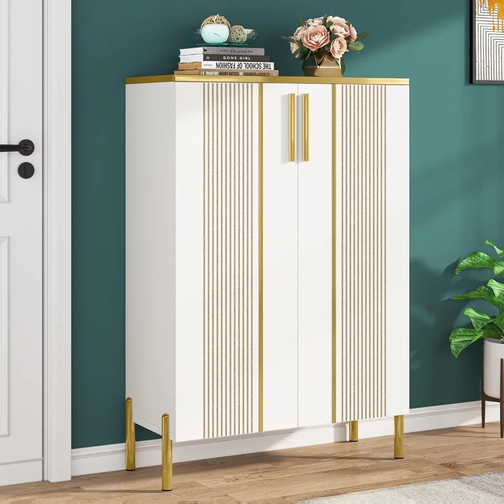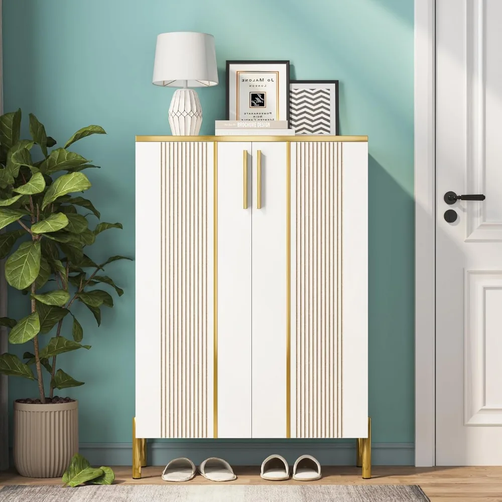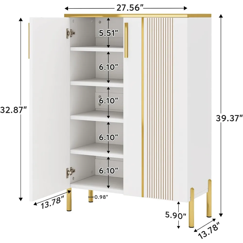 This shoe cabinet is designed for durability and reliability, constructed from premium E0 particle board with 0.59” thick boards that can support heavier items. It features a top shelf for bags, plants, and decorations, and a 6-tier adjustable shoe storage that can accommodate up to 24 pairs of shoes, including slippers and boots. The cabinet measures 27.56″ in length, 13.8″ in depth, and 39.37″ in height. With its elegant design, the shoe cabinet is crafted from wooden boards, coated with waterproof and wear-resistant white paint, and adorned with sleek white finish and golden metal handles and legs, making it a stylish addition to any home. Its simple and compact design allows it to function as a kitchen storage cabinet as well, with two swinging doors providing ample hidden storage to keep your space tidy. The vertical storage design is space-saving and ideal for hallways, entryways, closets, dormitories, and garages. Assembly is straightforward, and the product comes with a 12-month warranty and responsive customer service for any inquiries within 24 hours.
